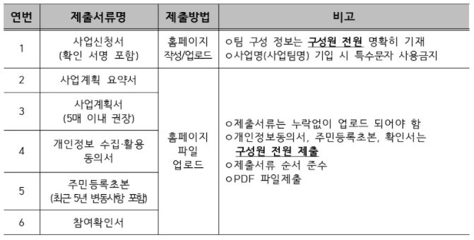 - 단, 팀을 구성하여 신청할 경우 선정 이후에는 반드시 공동대표로 사업자 등록을 완료해야 하며,
