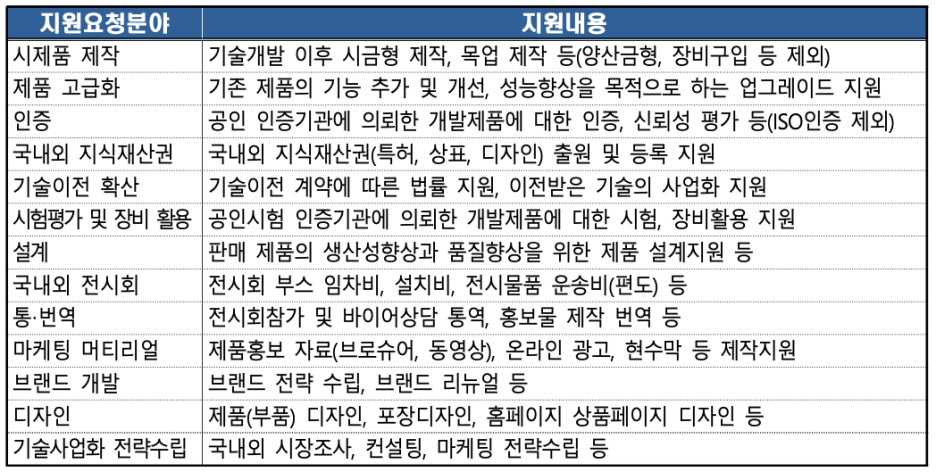 예) 시제품 제작 + 공인시험평가 + 특허출원 + 마케팅 머티리얼 + 전시회 + 통·번역