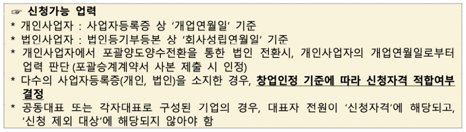 개인사업자의 개업연월일로부터 업력을 판단합니다.(포괄승계계약서 사본 제출 시 인정)
