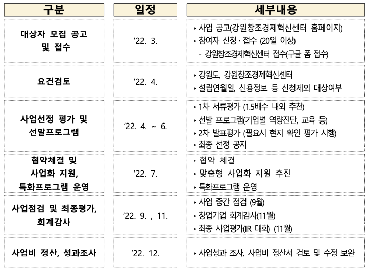 - 기업별 역량진단, 투자(IR 컨설팅, IR 대회 등), 수출 및 판로지원 프로그램 등