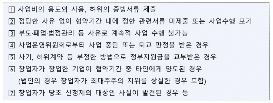 - 다음 중 어느 하나에 해당 시 협약 해약, 사업비 집행중지 및 회수 등 조치할 수 있습니다.