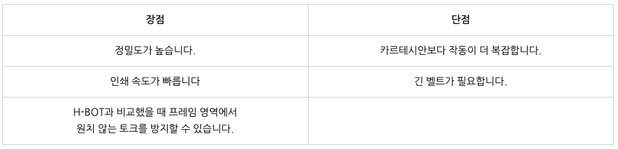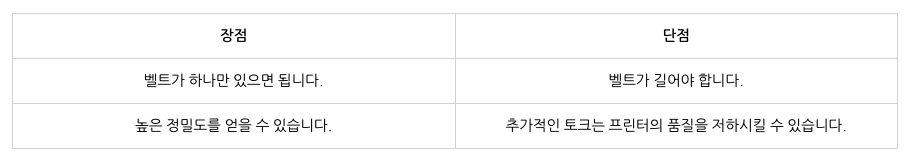 벨트의 진동으로 인해 프린팅 속도를 올리지 못하는 단점이 있습니다.
