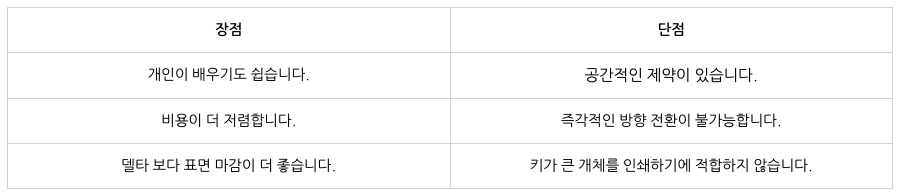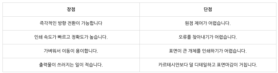 좌표에 따라 움직이기 때문에 복잡한 형상을 출력하기에 유리합니다.