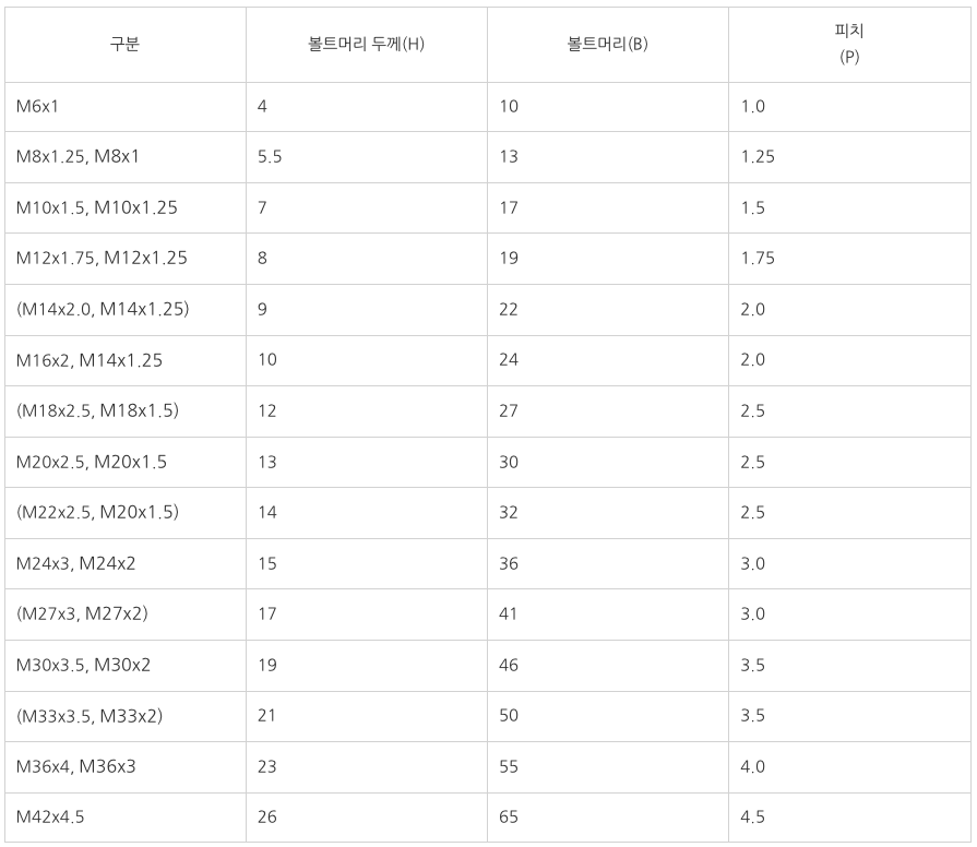 <볼트의 규격표(육각볼트)>