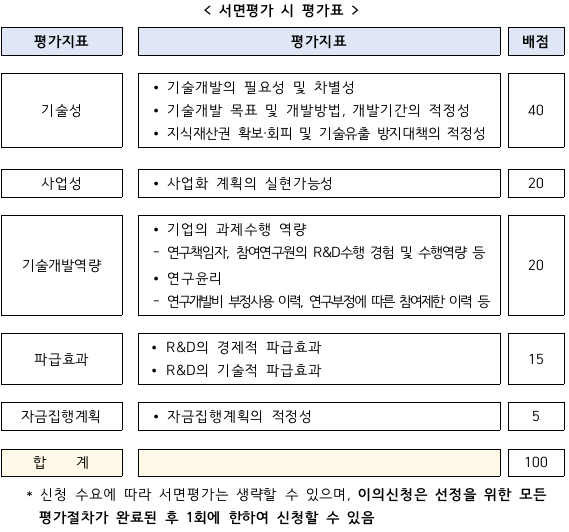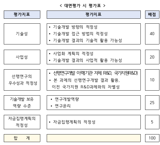 연구개발과제의 기술성, 사업성, 선행연구의 우수성과 적정성, 기술개발 보유 역량 수준, 자금집행계획의 적정성 등을 종합적으로 평가