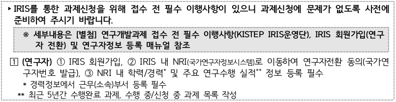 * IRIS(Integrated R&D Information System): 각 부처 및 전문기관별로 운영하고 있던 시스템을 하나로 통합한 범부처통합연구지원시스템