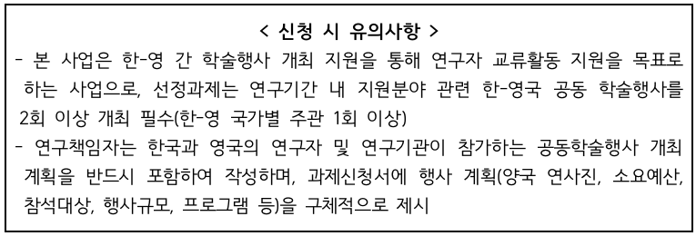 ※ 양국은 각각 자국의 연구자를 지원하며, 영국 연구책임자는 영국 측에서 지원 예정 (영국 측 연구기간, 연구비 등 지원 세부내용은 영문 공고문 참조)