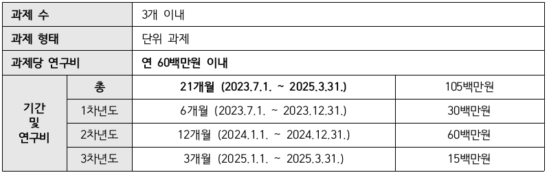 ㅇ 지원규모 : 3과제 이내, 과제당 연 60백만원(총 105백만원) 이내 지원 예정